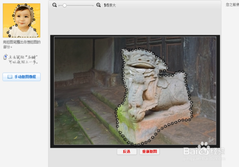 用户选定手动抠图功能后,需用抠图工具勾勒目标图像的边界线,绘制完毕后,边界线上会显现出若干个小圆点,如图示那样,即表明抠图作业已完成,用户亦能运用反向选择功能,选取边界线以外的内容,倘若对结果不满意,亦可点击重新抠图的按钮