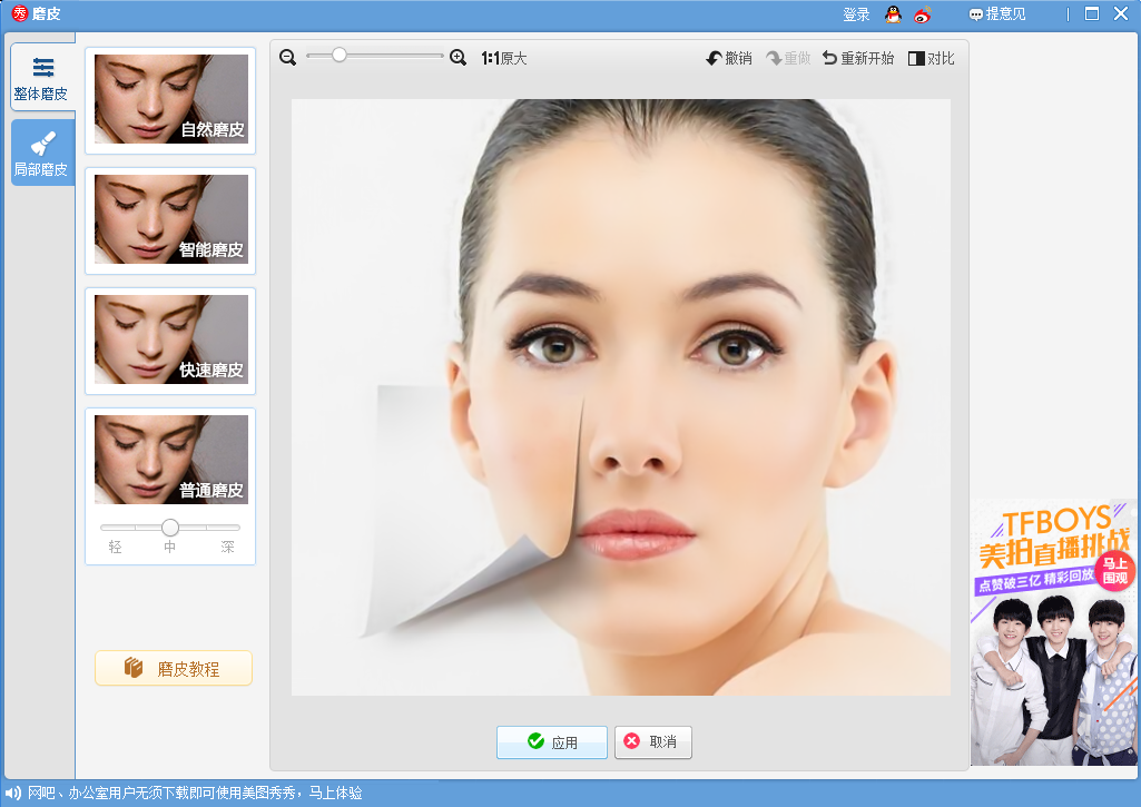 痘痘通过工具去除之后,我们能够选择局部平滑功能,并在该功能内适度处理,平滑处理完毕后,图像会显得更为真实,肌肤状态也会显得更加紧绷。